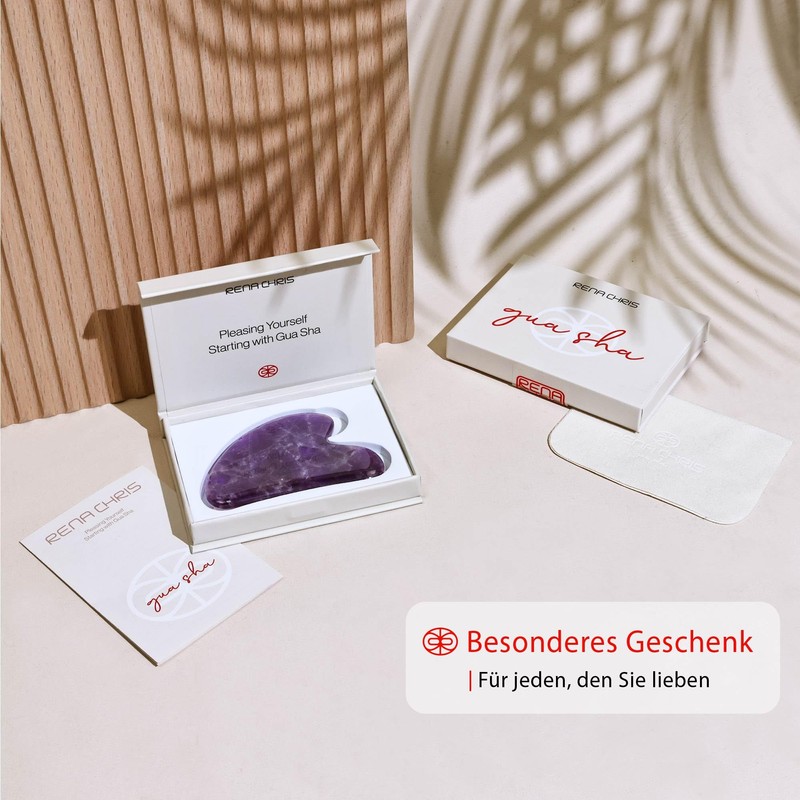 - NATÜRLICHER STEIN: Der Gua Sha Stein von Rena Chris wird in Handarbeit aus 100% Amethyst aus Brasilien hergestellt. Amethyst symbolisiert Harmonie, Liebe und Entspannung. Er kann Ihnen dabei helfen, Ihre positiven und negativen Emotionen auszugleichen und die Entspannung und Selbstfindung zu fördern.