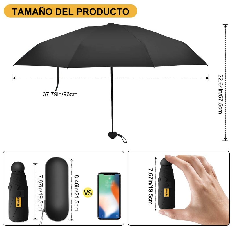 - 【Pequeño y fácil de almacenar】El sombrilla de bolsillo es un paraguas de cinco pliegues, no un paraguas ordinario de tres pliegues. Mide solo 19,5 cm/7,67 pulgadas de largo cuando se almacena
