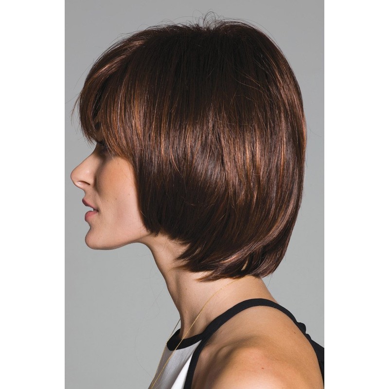 A collar length bob with an elevated perimeter and chipped ends. Length: Bangs 4.5", Crown 7.5", Nape 4" Cap Size: Average