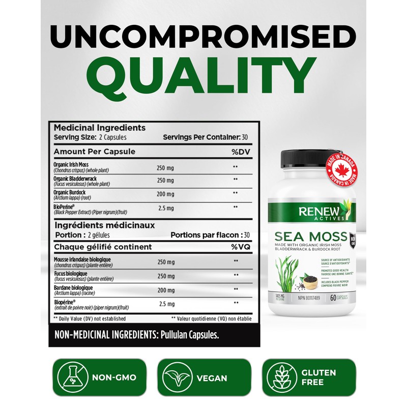 - BACKED BY QUALITY: Trust Renew Actives for supplements made under stringent quality control standards. Our Sea Moss Capsules are crafted with the premium ingredients, ensuring safety, effectiveness, and fulfillment of their promises. With 60 capsules per bottle, enjoy a full month of Sea Moss goodness for a balanced and healthy life. NPN: 80117489