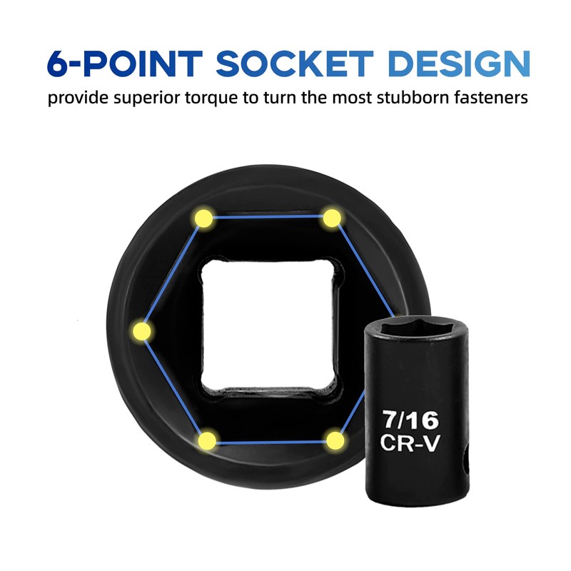 - 6-Point Design & Retention Hole: The 6-point design ensures a perfect fit between the socket and bolt, minimizing wear and prolonging the bolt's lifespan. The pneumatic hole keeps the socket securely connected, preventing it from falling off during use.