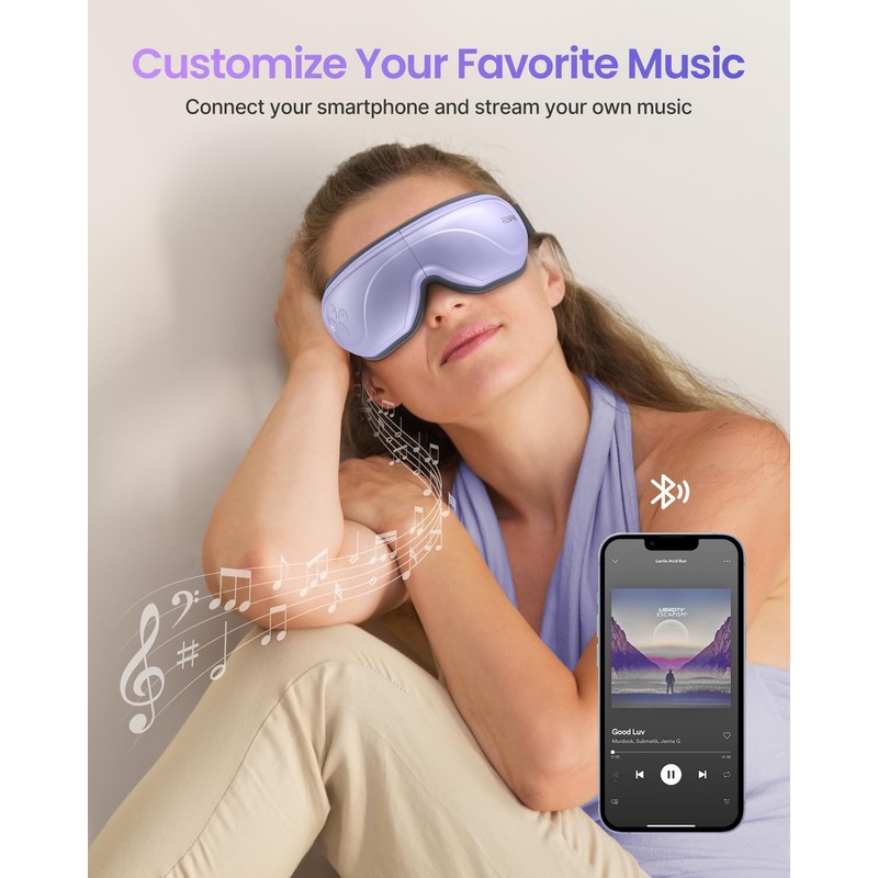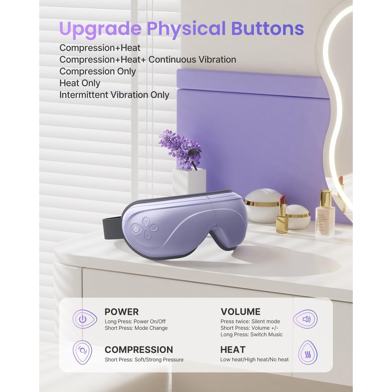 - 2 Levels Com-pression & Heat Settings: Choose between 2 adjustable com-pression intensity settings to increase your state of calm. Enable a soothing heat of 104℉ (40℃) or get a deeper heat of 107℉ (42℃) to help with eye puffiness, dry eyes, and more.