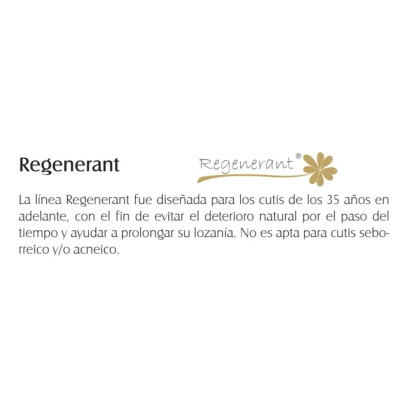 La línea Regenerant fue diseñada para los cutis de los 35 años en adelante, con el fin de evitar el deterioro natural por el paso del tiempo y ayudar a prolongar su lozanía. No es apta para cutis seborreico y/o acnéico.