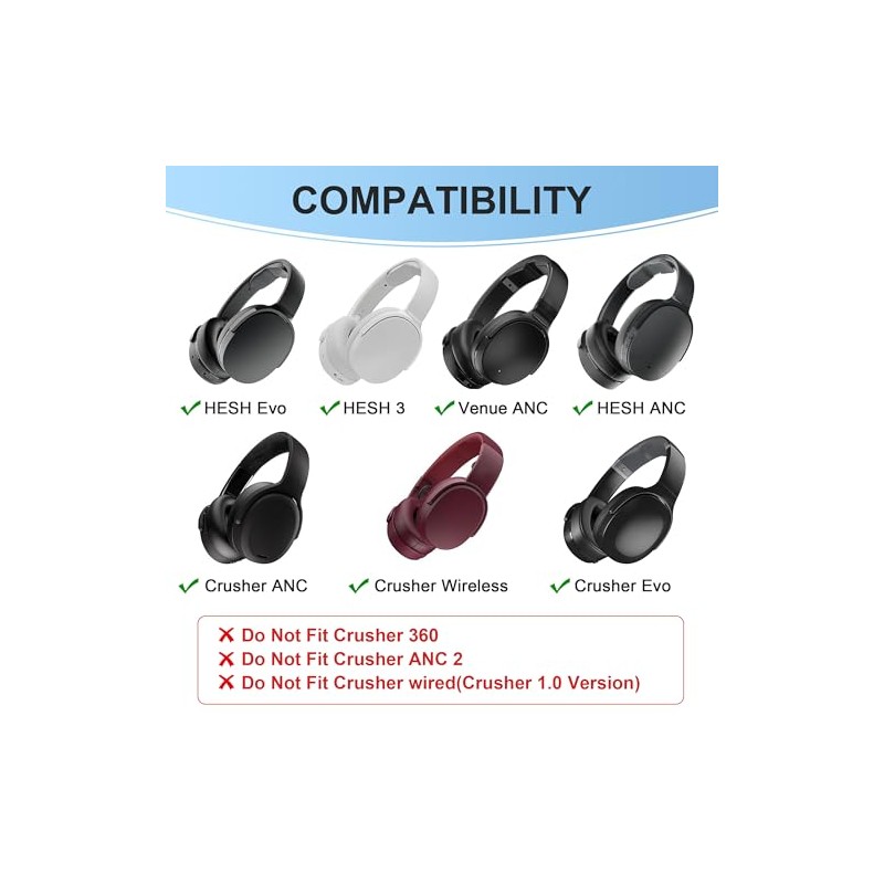 • Wide Compatibility – Perfectly fits multiple over-ear headphone models, maintaining excellent sound performance. Compatible with Skullcandy Crusher Wireless, Crusher Evo Wireless, Crusher ANC, Hesh3 Wireless, HeshEVO HeshANC, Crusher Evo Collina Strada, Crusher Evo Budweiser Limited Edition earpads