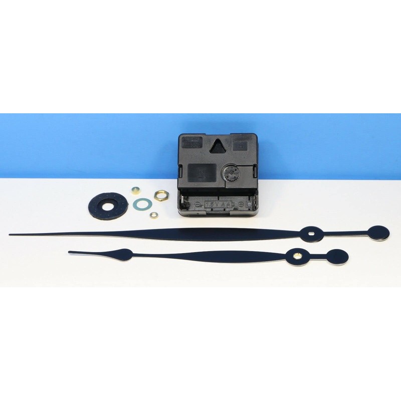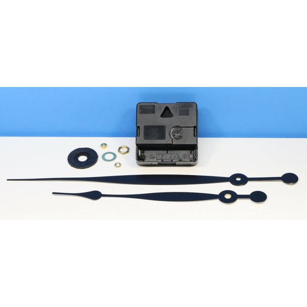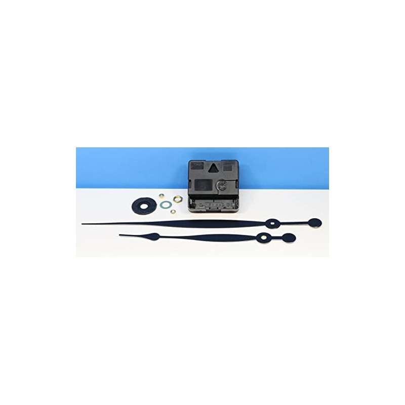 - NEW quartz clock movement , with a set of 8 1/4" black spade hands for a 17" dial. Hands are counter balanced to lessen the strain on the movement and improve accuracy. This model will work with dials up to 3/16" thick. Total shaft length is 11/16", shaft diameter is 5/16" inch. This movement comes with the mounting hardware shown in the photograph. The hanger is built into the back of the movement. The movement measures 2 7/32" x 2 7/32" x 5/8" thick.