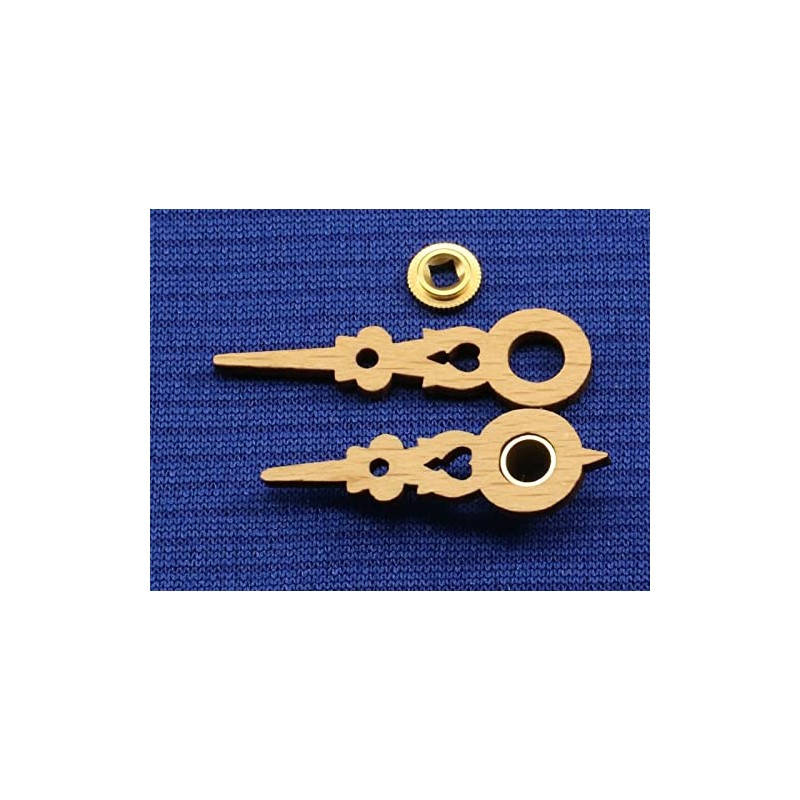 - Set of 2 SOLID WOOD hands for a Regula cuckoo clock movement. The wood can be stained. These are correct for a clock dial (face) of 70 mm or about 2 3/4" diameter. The hour hand has a pre-installed brass bushing with a 4.5 mm hole. The minute hand has a bushing insert with a square hole that measures 2.5 x 2.5 mm. This solid brass minute hand bushing is the correct size for Regula cuckoo clock movements. Thanks for looking!Made in Germany.