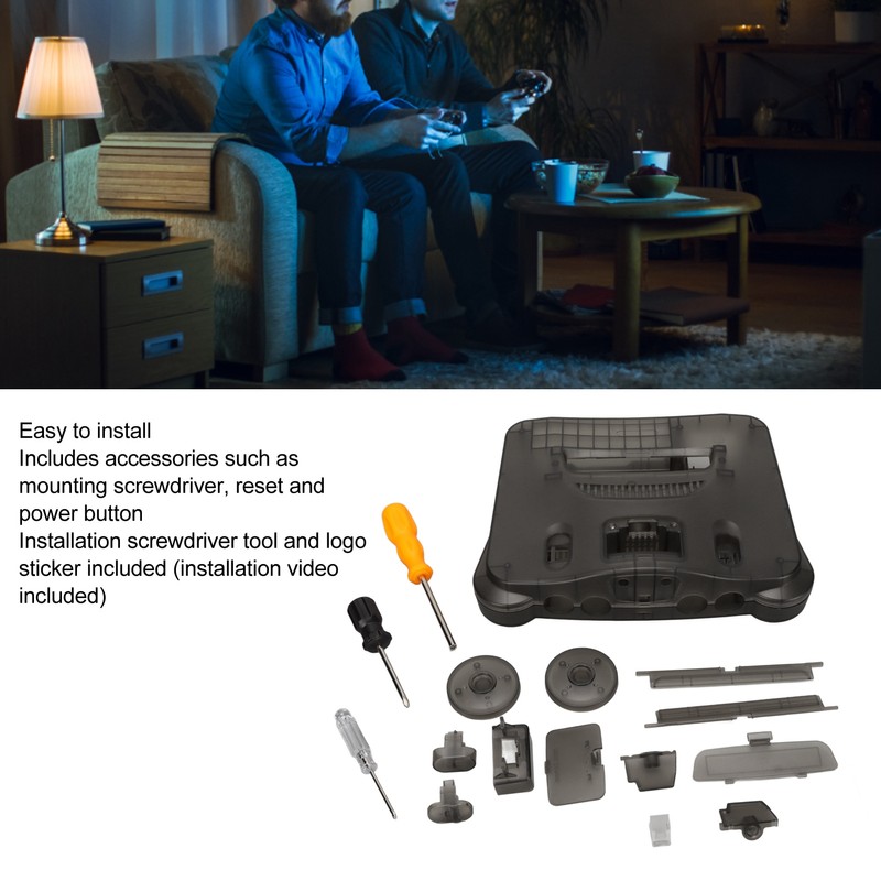 1、Perfectly Compatible: Retro video game console replacement case is compatible with all regional for N64 retro video game consoles (console not included). 2、Accessories: Package includes accessories such as mounting screwdriver, reset and power button. Logo sticker included. (Installation video included) 3、Exquisite Appearance: Retro video game console replacement case fine workmanship, exquisite appearance, transparent black, stain resistant and beautiful. 4、Ideal Accessories: Retro video game console replacement case is very practical and ideal for retro video game consoles. 5、Premium Material: Retro video game console transparent box is made of premium ABS material, sturdy and durable, long service life.