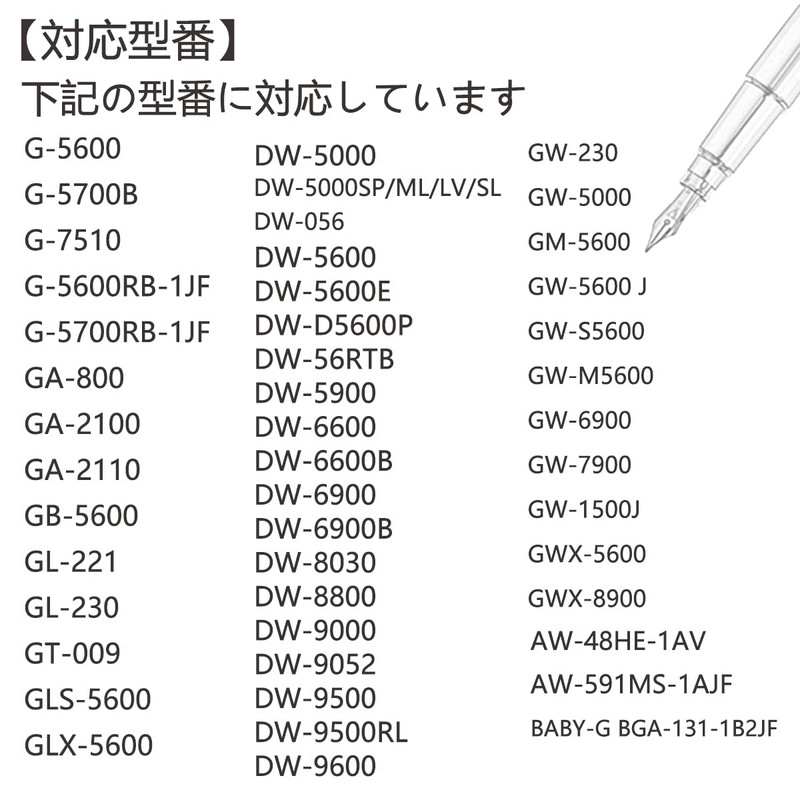 Compatible Model Numbers: DW-5000/056/5600/5600E/D5600P/56RTB/5900/6600/6600B/6900B/8030/8800/9052/9500/9500RL/9600RL/96000RL/96000000000RL/96000RL/9600000000RL/9600000000RL/9600000000RL/9600000000RL/96000000000RL/96000000000RL/960000000, G-56. 00/5700B/7510/5600RB-1JF/5700RB-1JF, GA-800/2100/2110, GB-5600, GL-221/230, GT-009, GLS-5600, GW-230/15000 J/5000 /5600/5600J/S5600/M5600/6900/7900, GWX-5600/8900, AW-48HE-1AV, AW-591MS-1AJF, BABY-G BGA-131-1B2JF