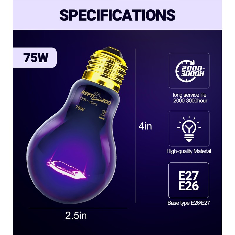 REPTI ZOO 75W Reptile Heat Lamp 2Pack Reptile Night Heat Bulb Night Heat Lamp Without UVA for Turtle Bearded Dragon Gecko Lizard and Snake E26/E27 Purple