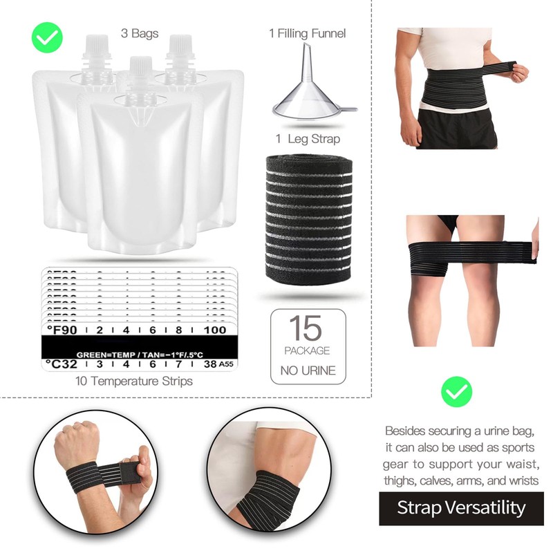 - Enhanced Product Combination:Get a convenient set that includes 3 Transparent Leakproof Bags, 10 Adhesive Temperature Test Strips, 1 Adjustable Leg Strap, and 1 Filling Funneltaking care that the package does not contain urine and other synthetic liquids. This versatile combination ensures you're well-prepared for various situations, catering to your daily needs effectively.