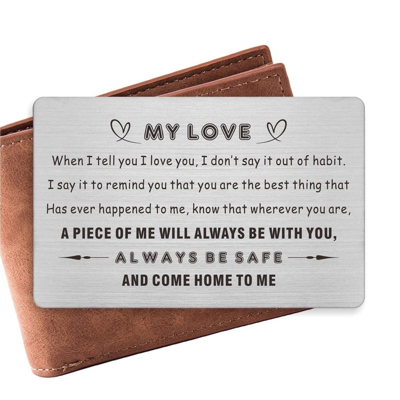 • Engraved Wallet Card for Him Husband: Always be safe and come home to Me. Just put this card in his wallet to tell him you love and drive safe or ride safe. God will know your love and bless for him