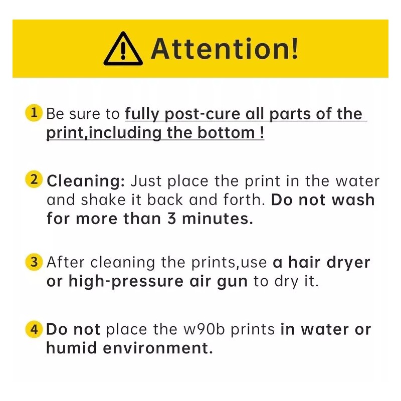 【Prints are easily cleaned with water】W90B printing resin selects high-quality water-based raw materials, with low liquid viscosity and good water solubility. Even the liquid residues in the gaps of the printed parts can be easily washed out by the water, so you can say goodbye to harsh and harmful cleaning agents.