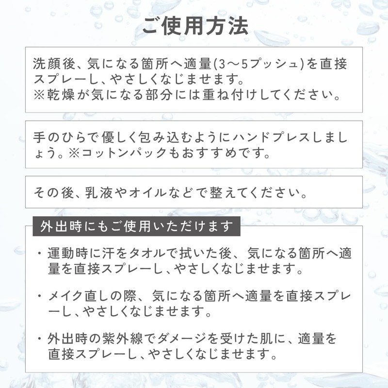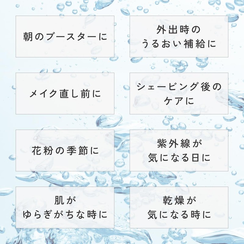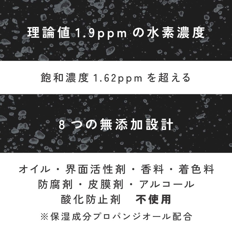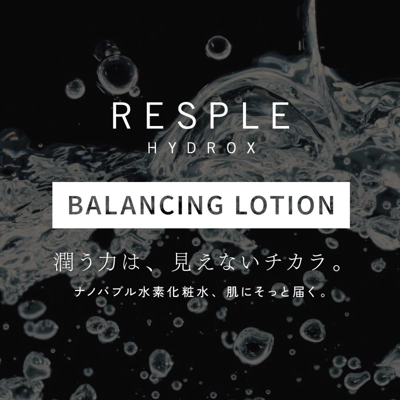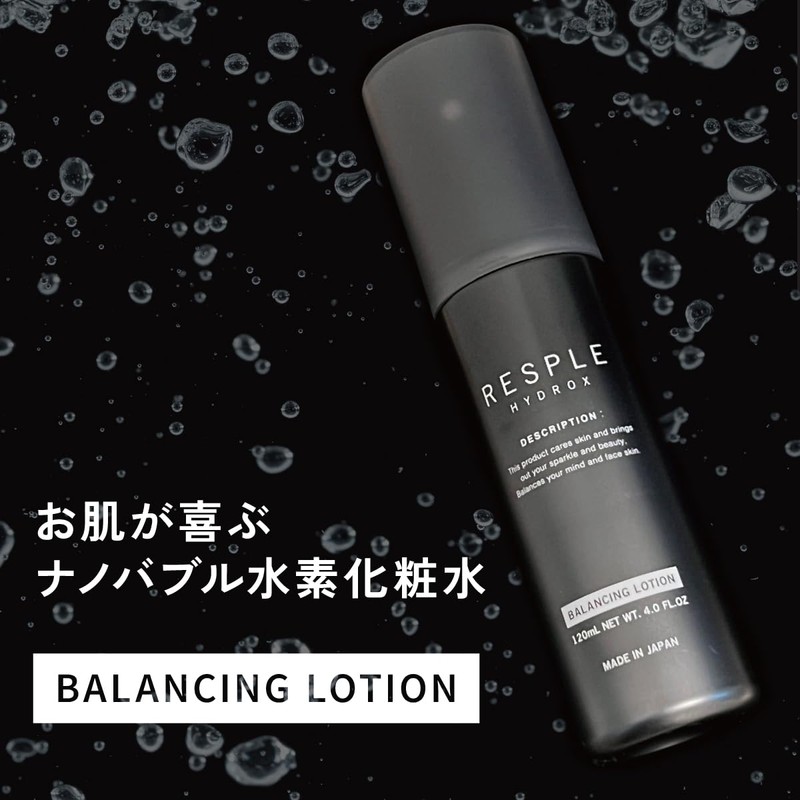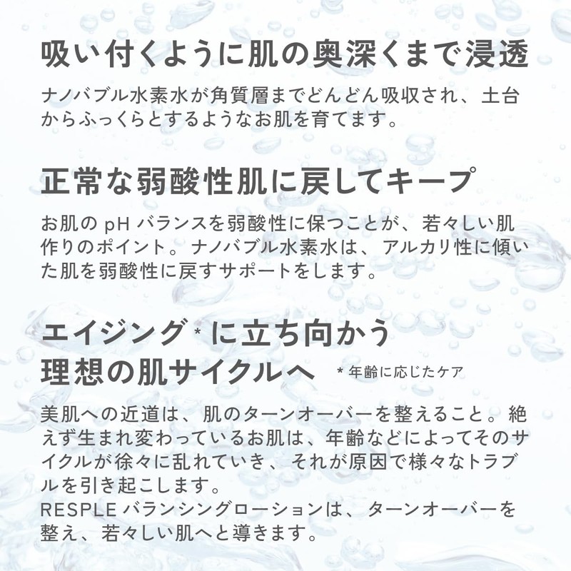 NanoBubble Hydrogen Lotion that will delight your skin. 100% base of nanobble hydrogen water. *No purified water or pure water. Rich in nano-size hydrogen bubbles (approximately 75 million pieces/cc) BECKMAN COULTER measuring theoretical value of 1.9 ppm (over 1.62 ppm saturation concentration) 8 additive-free designs including oil, surfactant, fragrance, coloring and preservatives, membranes, alcohol, and antioxidants free * Moisturizing component propanziol. ------------------------- For boosting in the morning, to replenish moisture when going out, before refinishing makeup, for after shaving, for pollen season, on days concerned about UV rays, when your skin gets loose, when you are worried about drying out, it penetrates deep into the skin like it absorbs nano bubble hydrogen water (*up to the stratum layer), and it grows a fluffy skin from the base. ■ Keep your skin back to normal weak acidic skin. Maintaining the pH balance of your skin with a weak acidity is a key point for youthful skin. Nano Bubble Hydrogen Water helps restore alkaline inclined skin to weak acidity. ■ For the ideal skin cycle to face aging The short path to beautiful skin is to adjust the turn over your skin. Constantly reborn skin will gradually disrupt the cycle depending on age, causing various troubles. RESPLE Balancing Lotion helps regulate turnover and leads to younger skin. ------------------------- [All ingredients] Uses 100% nano bubble hydrogen water *, pliers glycol, glycerin, propandiol, BG, placenta extract, iszen polysaccharide, hydrolyzed collagen, hyaluronic acid, aglucosilceramide, white gold, hydrogen