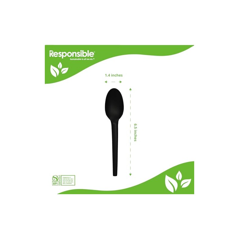 Responsible Products 6.5" Spoons, Certified Compostable Spoons, Extra Strength, Tree-Free, Made Without PFAS, Black (1000 Count)
