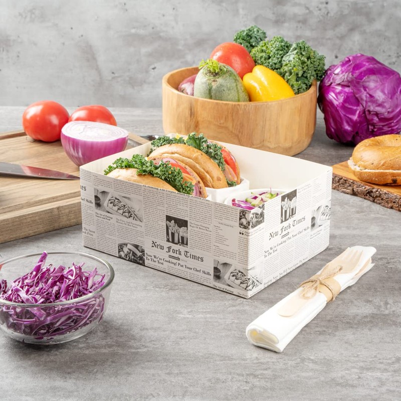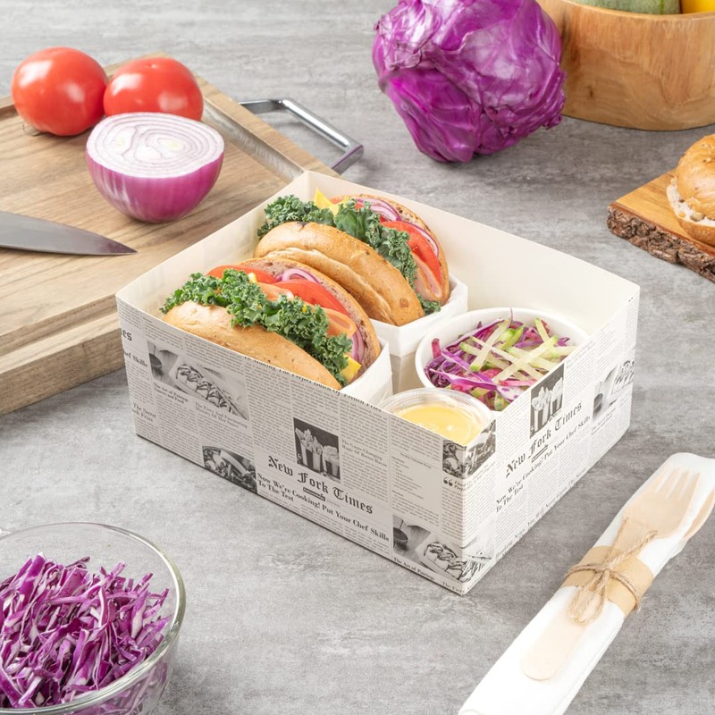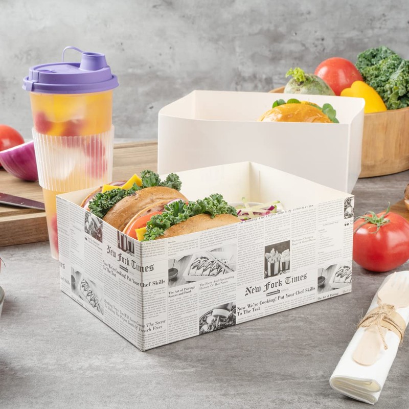 - NEWSPRINT FINISH: Featuring a stylish newsprint finish, these paper food containers give your sandwich presentations an elegant appearance. Hand out burgers in a stylish way and impress your guests!
