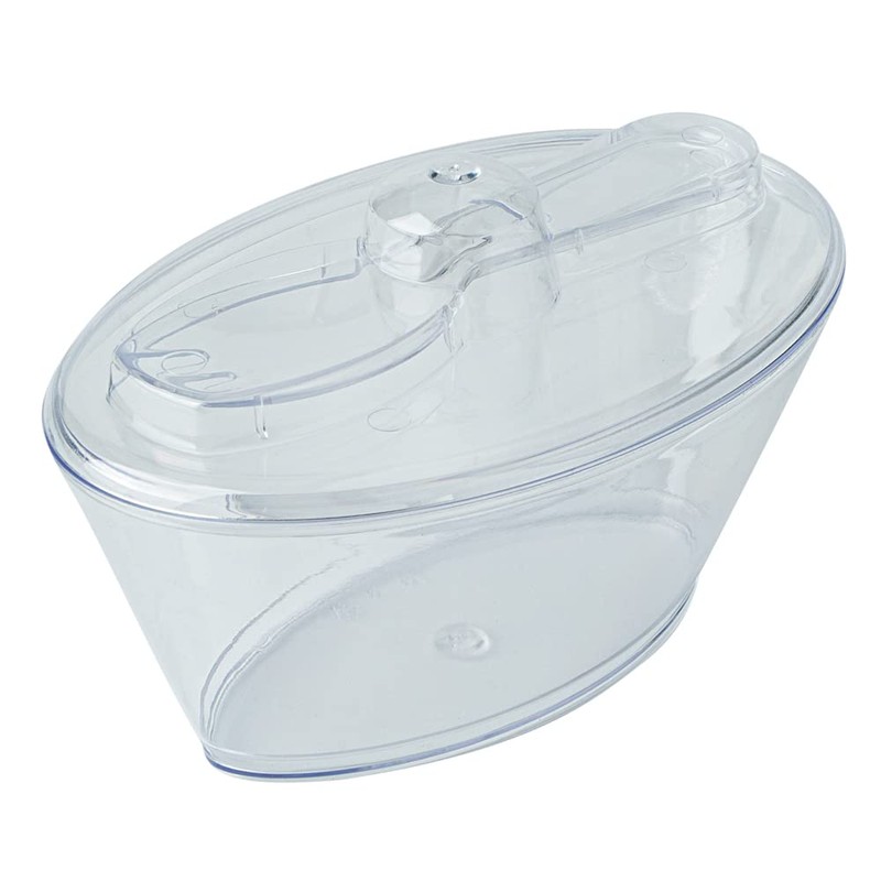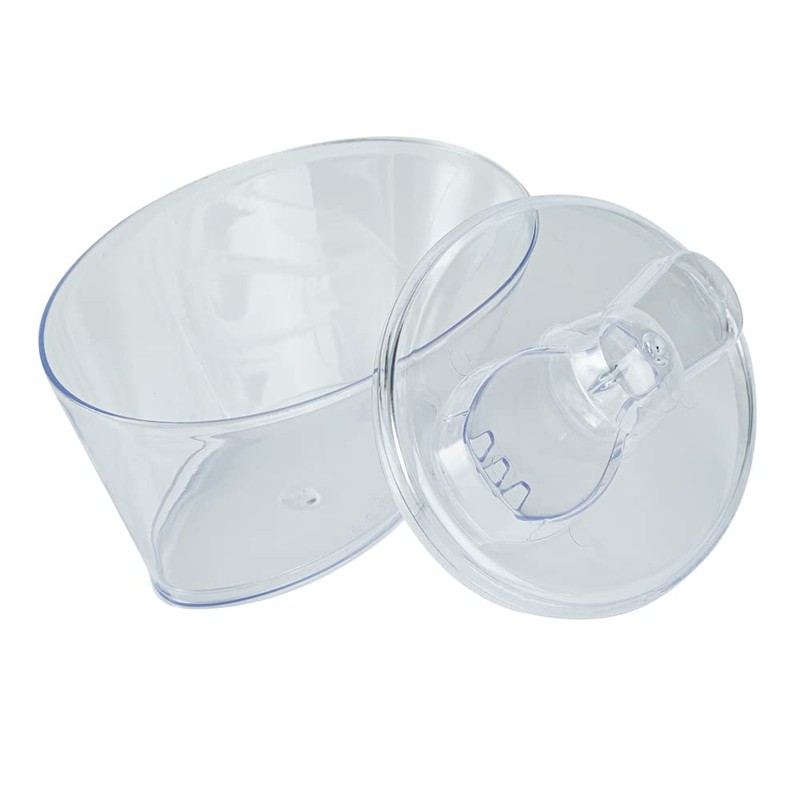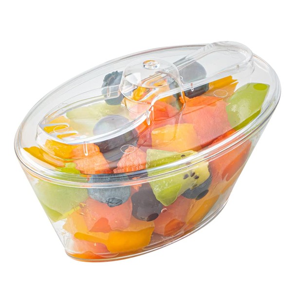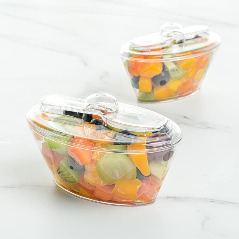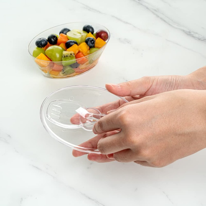 Offer customers ready-to-go snacks with our 4-ounce Oval Clear Plastic Deli Cups. Each deli cup includes a spork and lid to streamline your packaging process and allow guests to conveniently eat food on the go. Built with secure spork inserts, these unique food cup lids lock the spork in place during transport and guests can easily release the spork when they're ready to enjoy snacks. Crafted from premium plastic, these deli cups are 100% recyclable for hassle-free cleanup at your establishment. With a clear finish, these 4-ounce plastic cups expertly showcase the freshness of dishes at your deli, cafeteria, or bakery. These plastic deli cups and lids are conveniently stackable for easy storage in your commercial kitchen. Containing up to 4 ounces, the food cups measure 4.5 inches in length by 2.75 inches in width by 2.75 inches in height. Sold in a 100 count box.