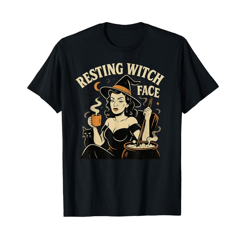 - Vintage witch design featuring a glamorous pin-up style witch with a bored, unimpressed “resting witch face.” Includes retro horror lettering, bubbling cauldron, crescent moon, spider, smoke details, and unimpressed cat. Perfect for Halloween lovers.