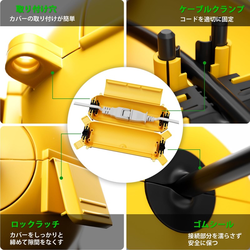- Extension Cord Safety Cover: 4 x Lock Latches, 2 x Cable Clamps, 2 x Mounting Holes, 2 x Cable Ties, Ensure Waterproof and Seal, Keeps Outdoor and Indoor Electrical Connections Dry and Safe. Easy to install and hang anywhere