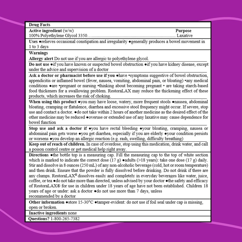 • Restoring your body's natural rhythm - RestoraLAX is an osmotic laxative containing 100% polyethylene glycol 3350 powder that works with the water in your body to soften and hydrate stool, and increase frequency of bowel movements.