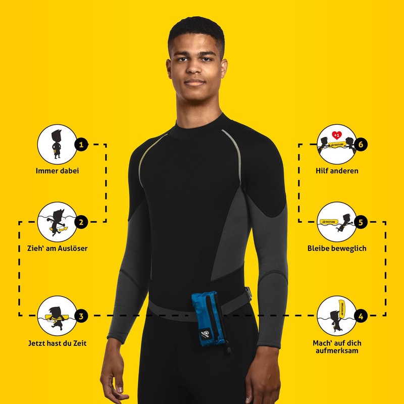 - Live in the moment – feel free and ready to give everything because the Restube Swimming Buoy keeps your back free. Perfect for extreme athletes thanks to the clasp that prevents accidental inflation due to harsh circumstances or extreme forces