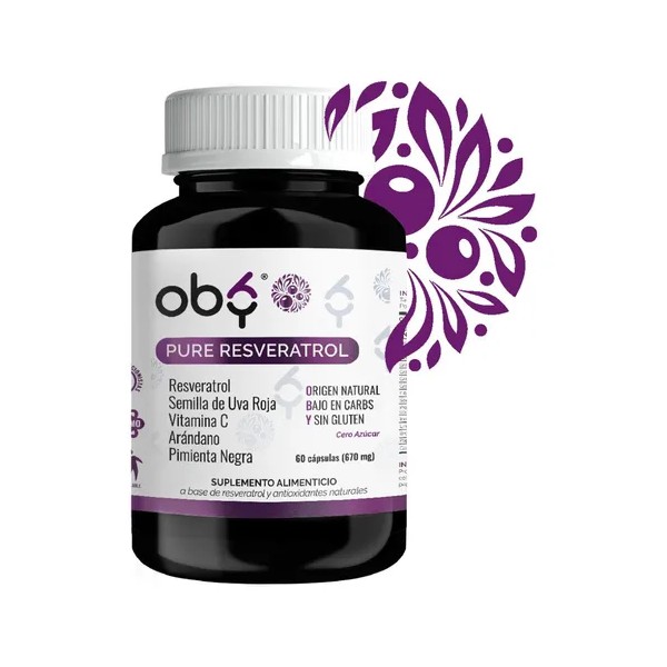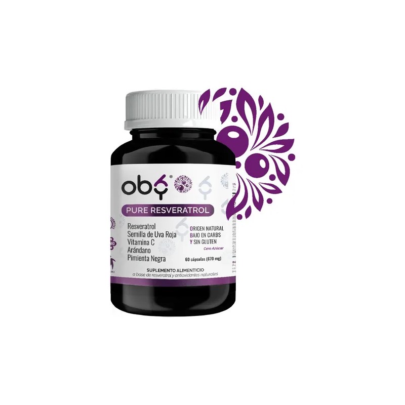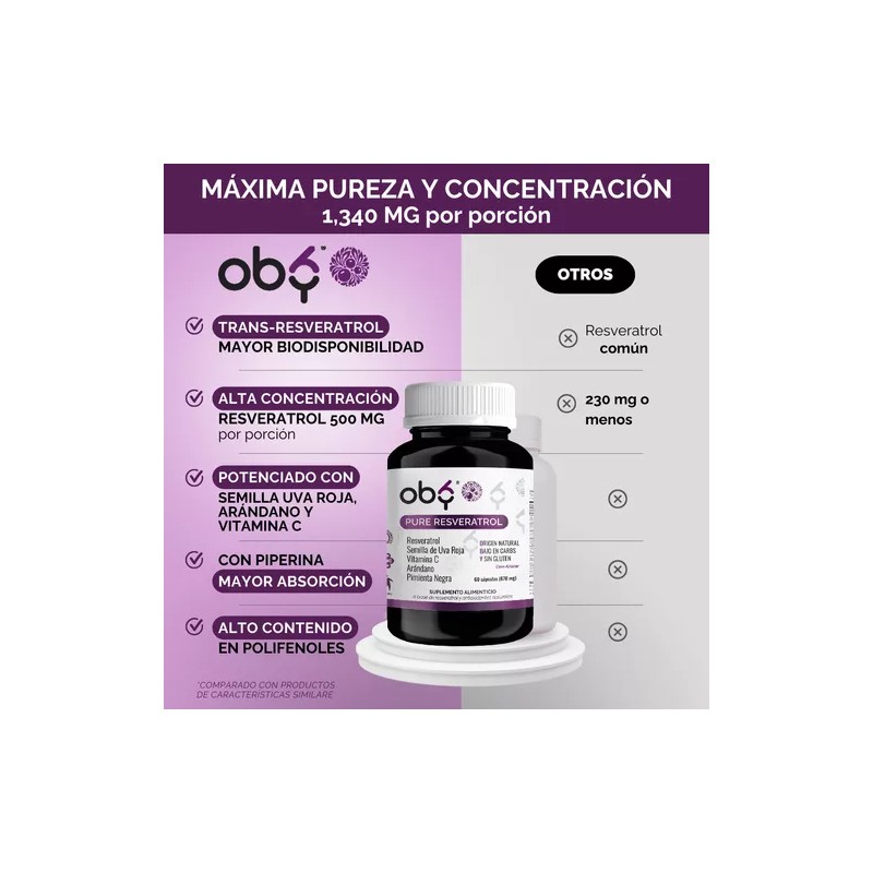 ¡Descubre Oby Pure Resveratrol! Cada cápsula contiene una exclusiva combinación avanzada de 5 ingredientes 100% naturales: Trans Resveratrol puro, Semilla de Uva Roja, Vitamina C, Extracto de Arándano y Pimienta Negra para mayor absorción. Alto contenido en Polifenoles. Ideal para hombres, mujeres y personas mayores. Cada porción te ofrece una alta concentración de 1,340 mg. 100% vegano.
