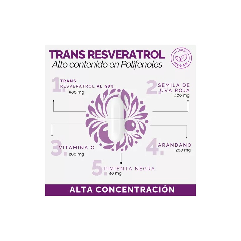 Resveratrol 100% Puro y Vegano Potenciado Pimienta Negra, Semilla Uva, Vitaminas y Arándano | Max Concentración Trans Resveratrol y Polifenoles Oby 60 Capsulas