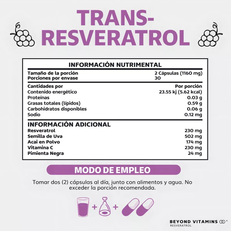 Resveratrol Beyond Vitamins contiene una combinación completa de Reveratrol, Semilla de Uva, Acai en Polvo, Vitamina C, Pimienta Negra. Nuestro producto son el resultado de investigación y estrictos estándares de control de calidad. Es ideal para hombres, mujeres y personas mayores. Nuestro Resveratrol es libre de lácteos, soya, hormonas, antibióticos, conservantes, azúcar, colorantes y sabores artificiales. Es VEGANO.
