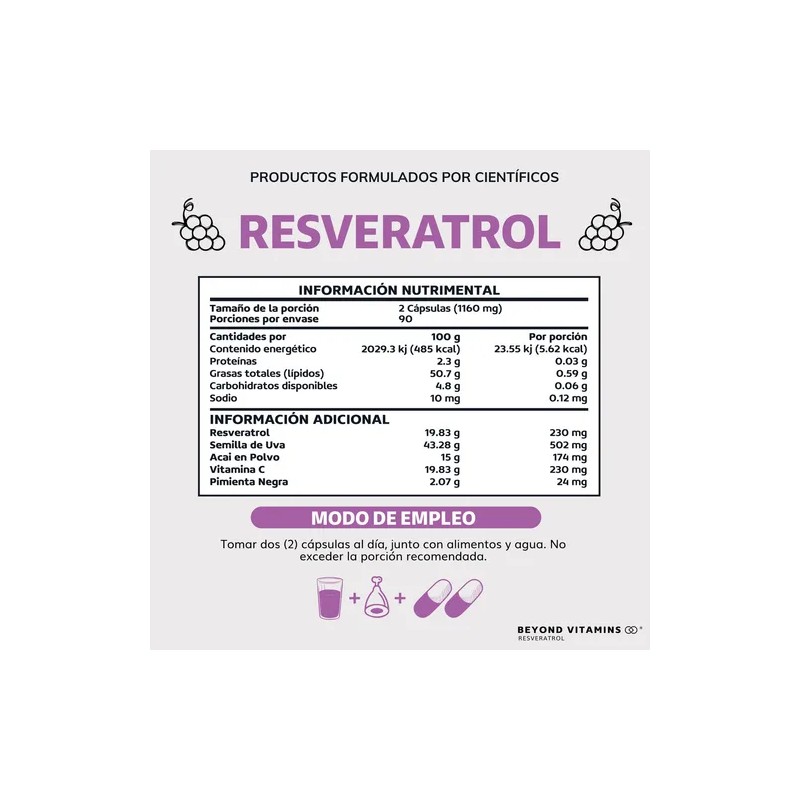 Resveratrol Beyond Vitamins contiene una combinación completa de Reveratrol, Semilla de Uva, Acai en Polvo, Vitamina C, Pimienta Negra.