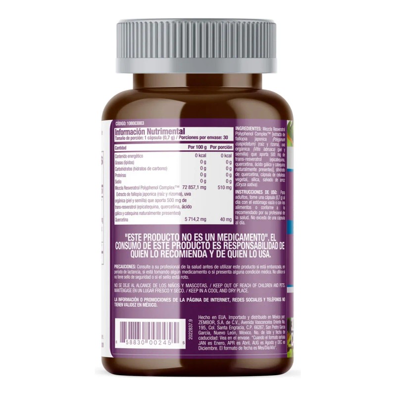 Cada cápsula contiene 500 mg de resveratrol puro, una dosis eficaz para reforzar tus defensas internas, proteger tu ADN celular 🧬 y mantener un corazón fuerte. Además, el resveratrol está relacionado con la activación de las sirtuinas 🔬, proteínas vinculadas a la longevidad y al bienestar metabólico, convirtiéndose en un aliado para mantener la energía ⚡, la claridad mental 🧠 y la vitalidad a lo largo del tiempo.