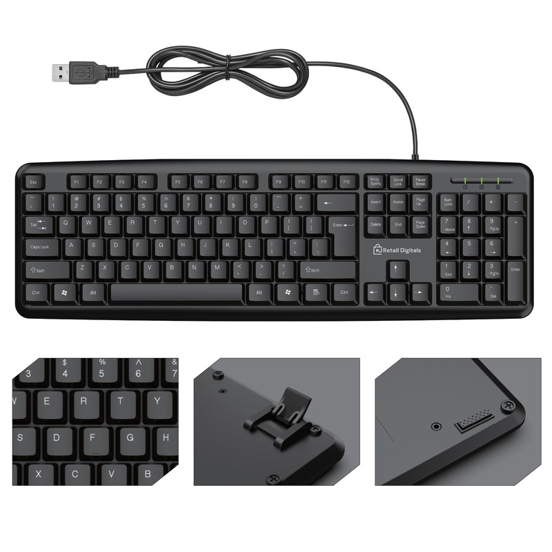 Finished in sleek black, this keyboard’s sophisticated design adds a modern touch to any workspace, making it a versatile addition that complements both your tech setup and decor. Choose the Retail Digitals Wired Keyboard for a durable, stylish, and efficient typing solution that enhances any environment.