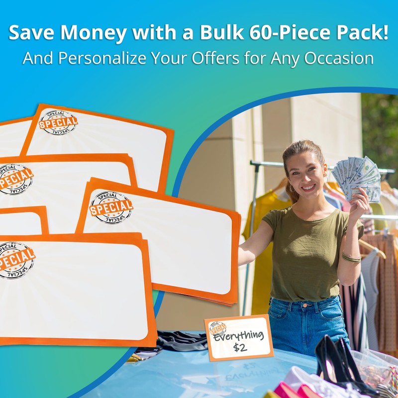 Each order comes with a total of 60x 5” x 7” (10cm x 15cm) price burst cards with “Special” across the top written over an official stamp-looking decal.