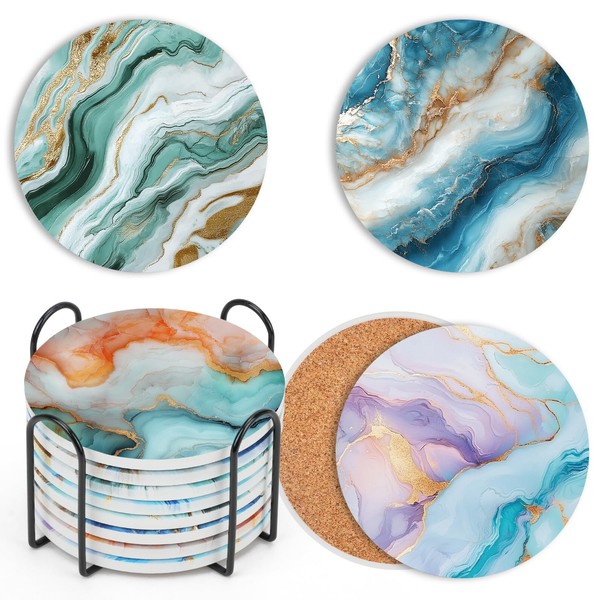 - 【Unique Pattern Design】: This ceramic marble coaster set features 4 distinct patterns—jade, lavender, green, and blue marble. Each pattern is exquisitely crafted to mimic the natural beauty of marble, adding a touch of elegance to your table setting. With 2 coasters for drinks in each pattern, you get a total of 8 coasters and 1 holder.