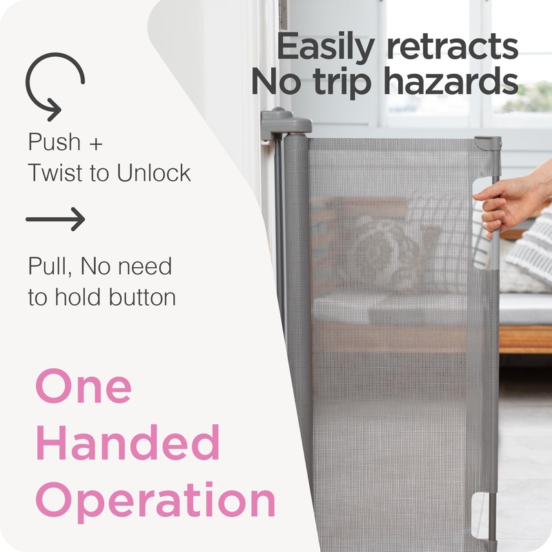 - PRODUCT DETAILS: Extending up to 55” wide and 33” tall this hardware mounted Retractable Baby Gate includes all components for easy installation.