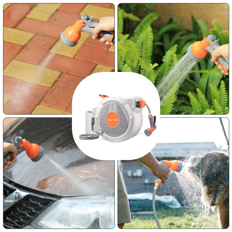 Equipped with a versatile 10-pattern spray nozzle, including jet, soak, angle, flat, cone, shower, center, rinse, and spray settings, this hose reel meets all your watering needs—from watering your garden and washing your car to bathing pets and cleaning doors and windows. The universal nozzles ensure compatibility and convenience.