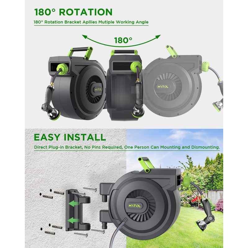 Retractable Garden Hose Reel, 5/8 Inch x 82 ft + 6 ft Wall Mounted Water Hose Reel with Auto Slow Rewind System, 10-Pattern Nozzle, Any Length Lock, 180° Swivel Bracket, Ideal for Easy Watering