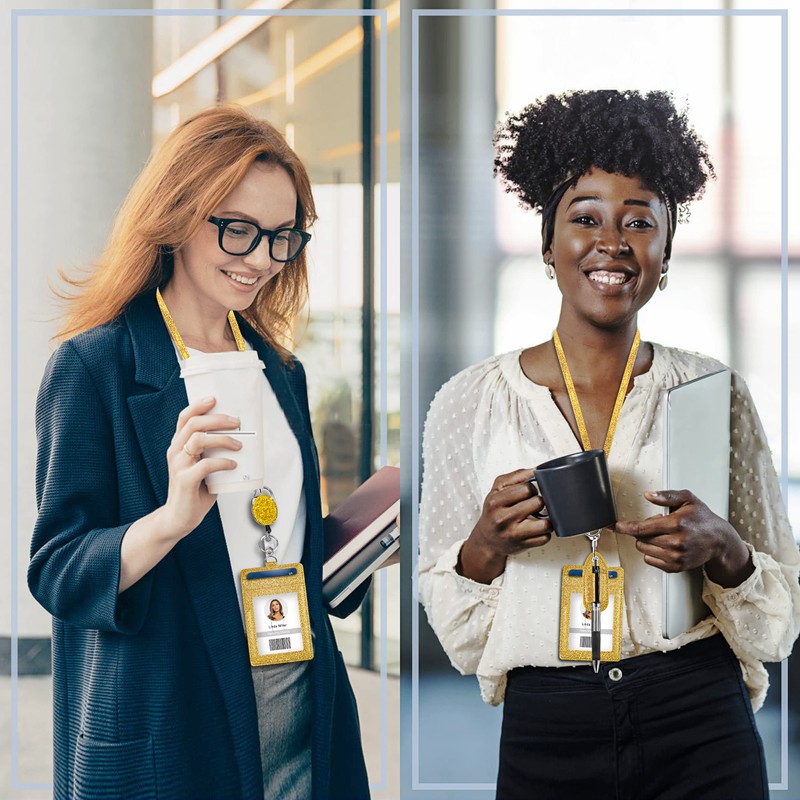 - The Ultimate Badge Set: Many sellers offer ID badge holders with lanyards or a badge reel with a plastic ID holder. This combo is unique in that it is loaded with accessories that you use every day. Not only do you receive an ID holder and lanyard, but you also get a stylish bling rhinestone retractable badge reel and a detachable pen holder that all matches.