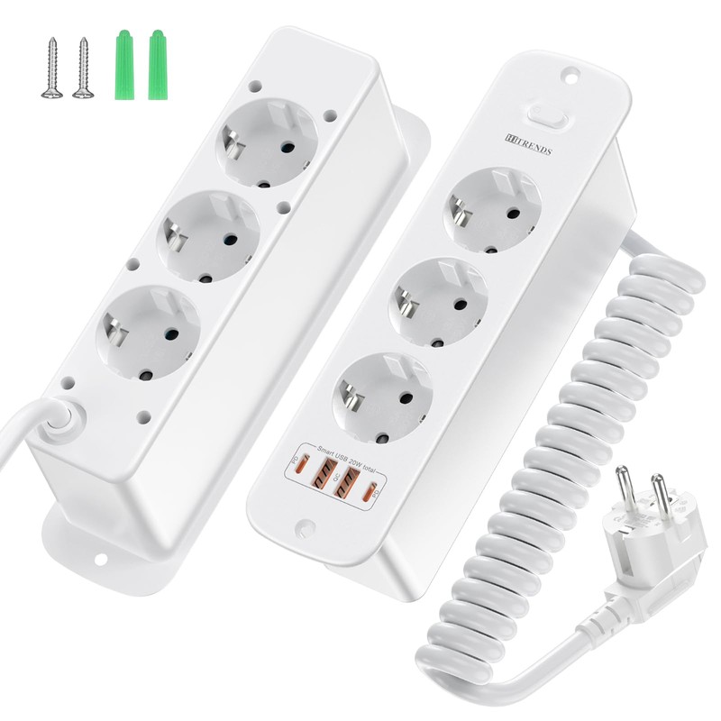 - Retractable socket: this power strip with USB has 3 sockets on each side, so a total of 6 sockets (16A; 100-250V; max 4000W; 50-60Hz), 2 USB-A ports, 2 USB-C ports. Built-in power strip provides perfect performance in the smallest space and is therefore perfect for charging phones, tablets, computers and more.