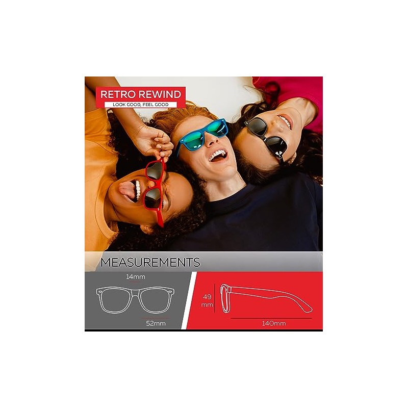 - 🕶️ Diseñados para adaptarse a cualquier gusto, cualquier forma y a cualquier conjunto de ropa: Las gafas de sol Retro Rewind son una mezcla de estilo vintage, moda contemporánea y tecnología moderna. Estos lentes de sol acentuarán tu atuendo casual, informal, atlético o de negocios y te ayudarán a lucir arreglado y sofisticado. Disponibles en más de 50 combinaciones de colores.