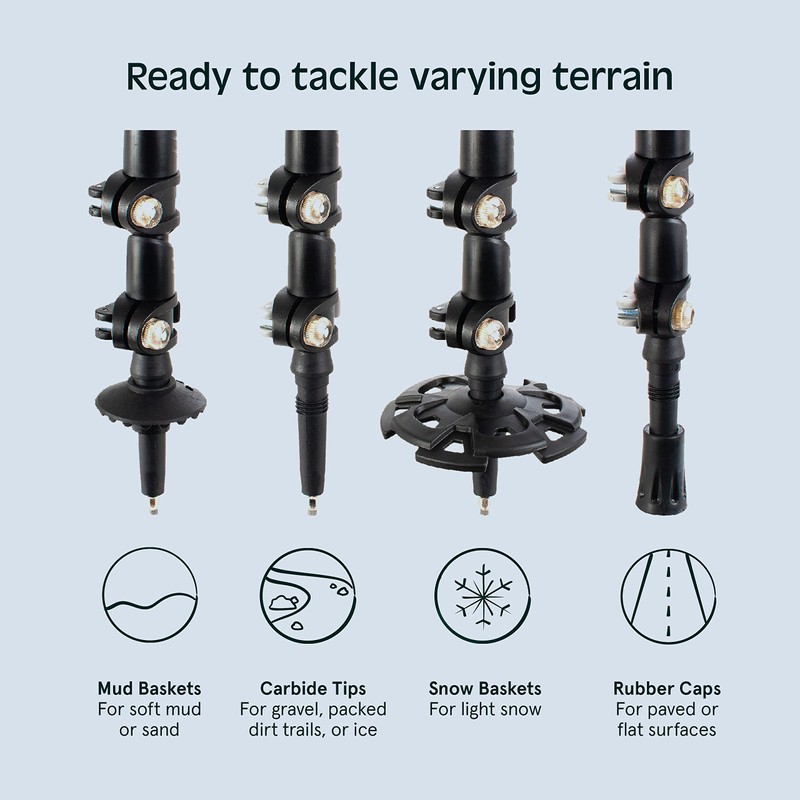 • Traction & Stability: Heel lifters and full-floating pivot system increase traction and reduce fatigue while exploring steep terrain. Trekking poles with multiple terrain attachments add stability and balance.