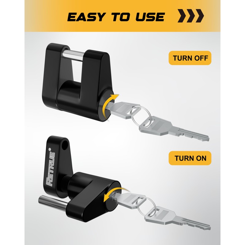 - Easy to use. This padlock-style trailer tongue lock has a heavy-duty look to deter theft. Uses a simple 1/4-turn lock activation for convenient locking and unlocking, Simply spin the flat key 5-7 times to open or close our hitch locking pin