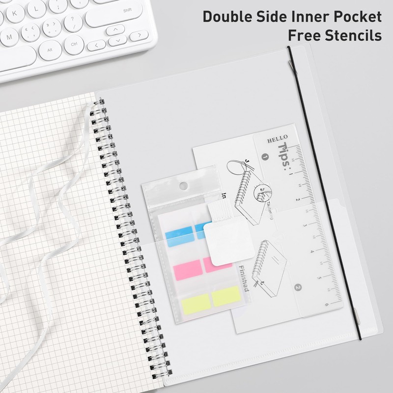 - Bonus 4 practical features: design your notepad according to your needs with these functions: Self-adhesive pen holder for storing pens. ②Removable bookmark ruler for measuring dimensions or marking your place. ③DIY bookmark with a ribbon for self-attachment to the spiral that serves as a bookmark. ④Double-sided PVC bag for storing various items.