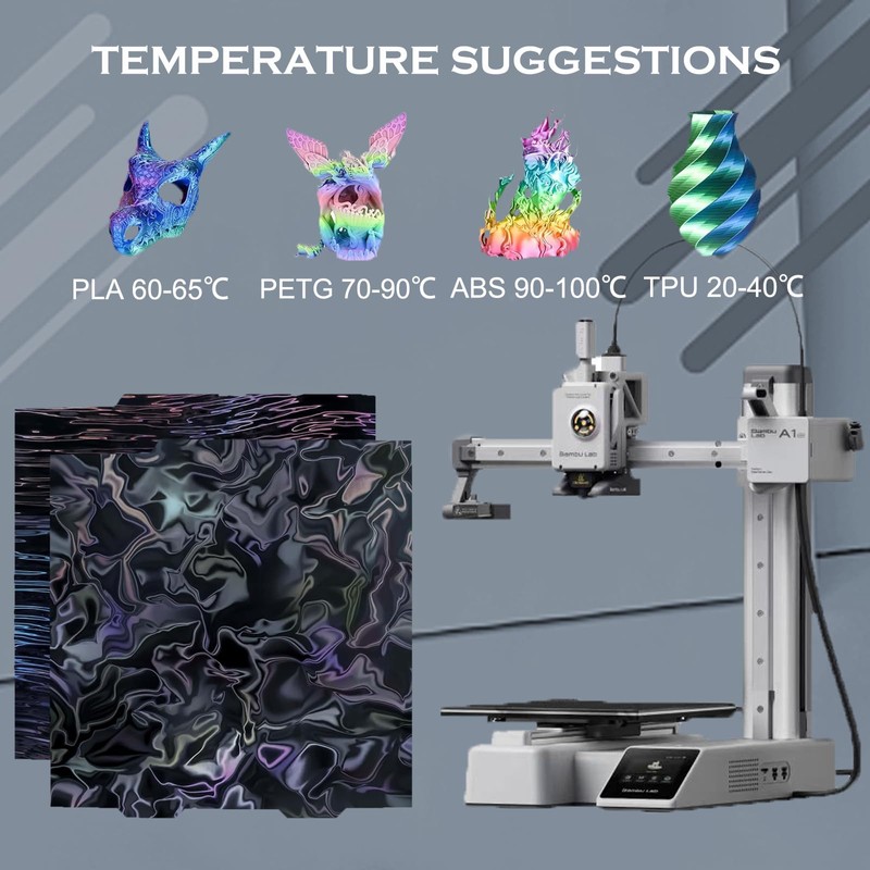 - 【 Compatible Filaments and Temperatures】We recommend the following filament and temperatures PLA/TPU/PETG/ABS, PLA: 60-65℃; PETG: 70-80℃;ABS:90-100℃ TPU:20-40℃. Please adjust the parameters if you need to print other filaments.