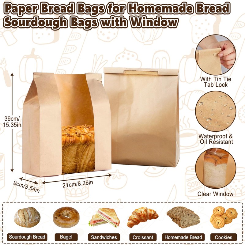 - Paper Bread Bags: Equipped with 10 large bread bags made of kraft paper, waterproof, oil-proof. The bread bag with tin tie tab lock , which can be easily opened or closed, no need additional ties or machine to seal it. Built-in transparent window allows you to easily see the delicious dishes inside. Very suitable for packaging various baked goods and snacks