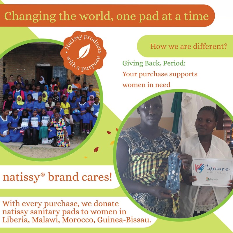 - - - It is our mission to help the next generation of women realise that their body is unique. Therefore we believe the Natissy reusable fabric sanitary pads are the perfect solution for an ecologically-minded and health-conscious woman. The packaging is also biodegradable (made from corn / potato starch) and can be recycled.