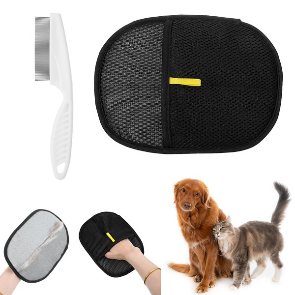 Reusable Pet Hair Removal Glove with Large-Toothed Flea Comb for Cats Dogs, Electrostatic Grooming Glove, Efficient Fur Remover for Couch, Clothes, Carpet, Bed Sheet