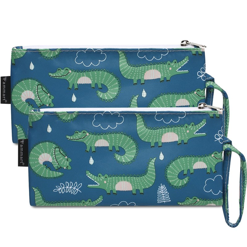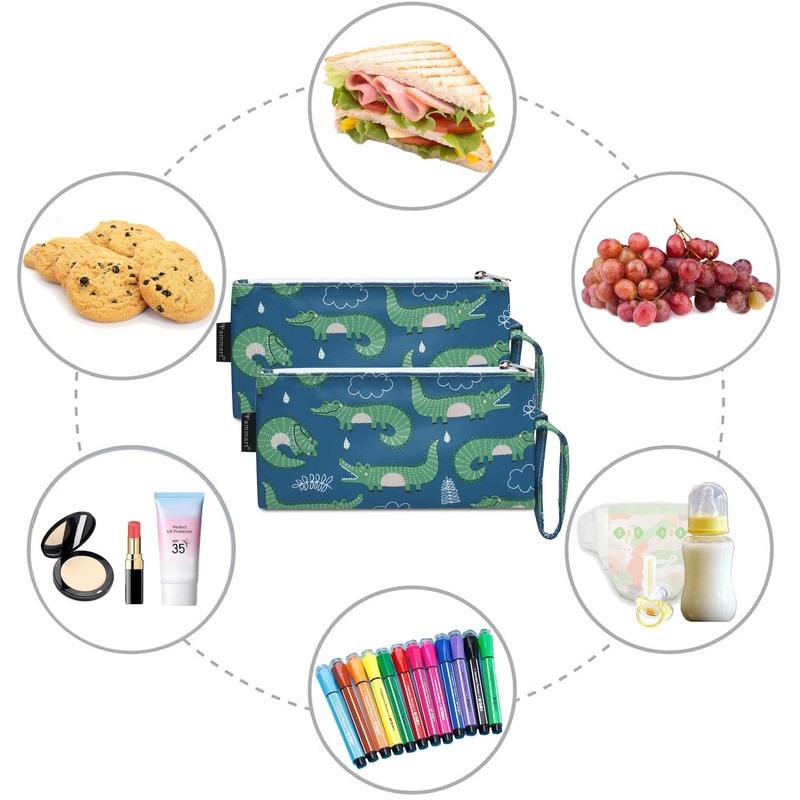 Reusable Sandwich Bag/Snack Bag for Kids & Adults, Dual Layer Lunch Bag with Handle, Washable, Food Safe, BPA Free (2-Pack, Green Crocodile)