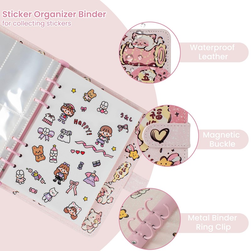 Reusable Sticker Book Collecting,A5 Binder Album Sticker Storage Organizer with Blank Release Paper and Pocket for Adult Kids,Cartoon Leather Binder Cover & Magnetic Buckle Closure(Pink)