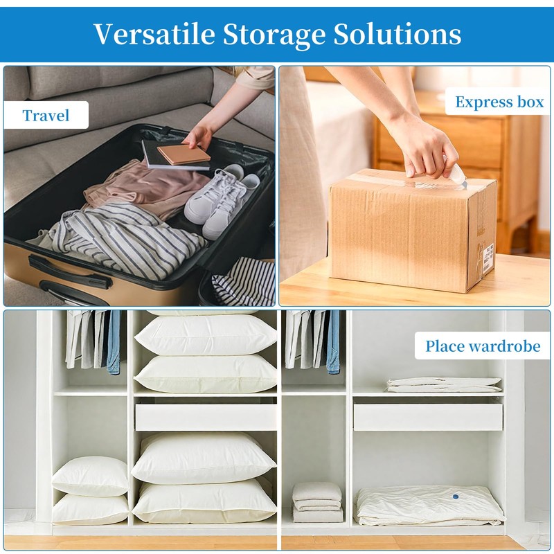 - No Electricity Needed Compact hand pump works in seconds—press 3-5 times to vacuum seal. Great for airplanes, road trips, or quick closet compression.