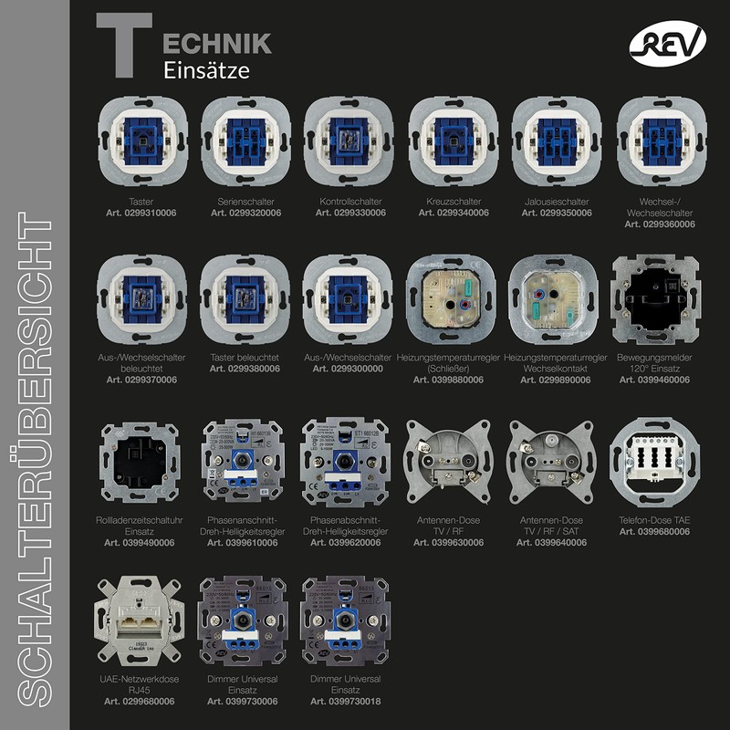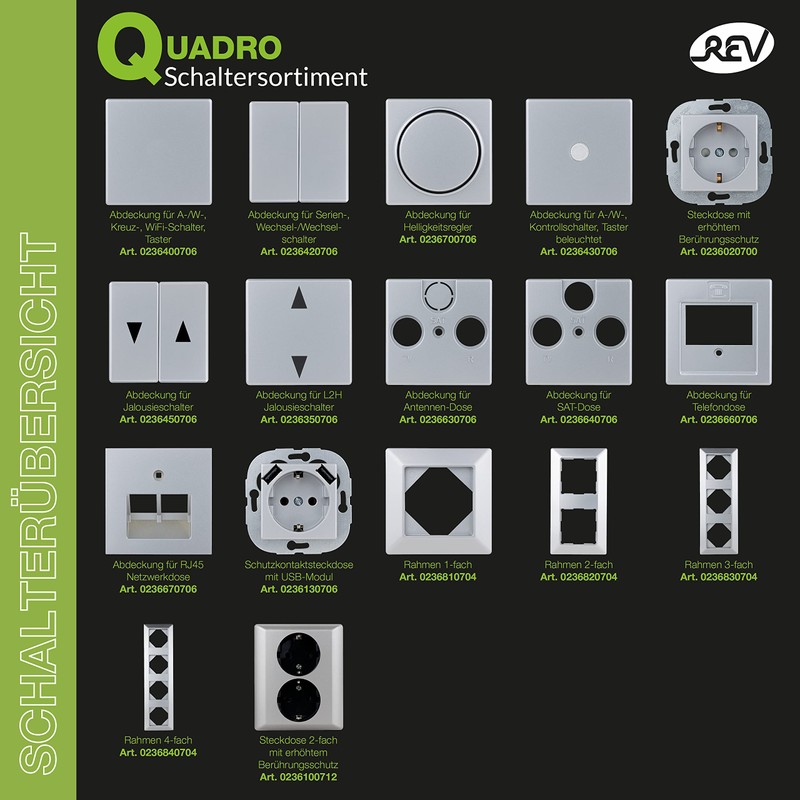 - To match the cover of the Quadro switch series is the REV technology: series switch (0299320006) / double toggle switch (0299360006)