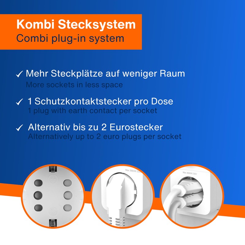 - Practical combination plug-in system: either use a protective contact plug or place up to 2 Euro plugs at the same time